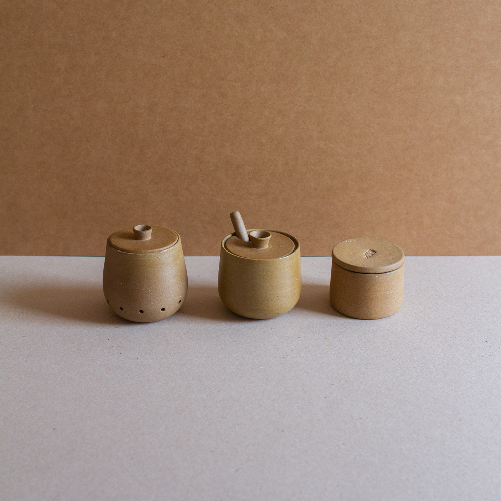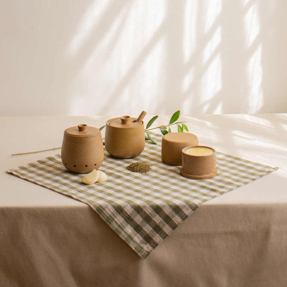 Empecemos por la azucarera: una pieza de 8×8 cm con una cuchara interna que te permite servir el dulce con elegancia. Su acabado natural en pasta cerámica y esmalte interior crea un contraste sutil y atemporal. Junto a ella, un contenedor de ajos de las mismas dimensiones, pero sin esmalte, para mantener frescos tus dientes de ajo sin humedad ni resequedad.